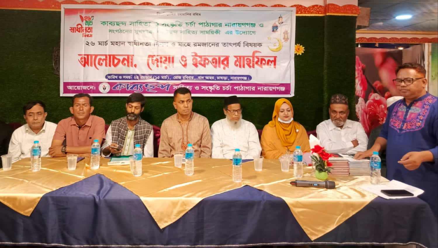 সামাজিক, মানবিক ও সৃজনশীল সাহিত্য সংগঠন কাব্য ছন্দ সাহিত্য ও সংস্কৃতি চর্চা পাঠাগার নারায়ণগঞ্জ ও সংগঠনের মুখপাত্র সাহিত্য সাময়িকী কাব্যছন্দ -এর উদ্যোগে কবি,লেখক, সাংবাদিক, সংগঠক,সাংস্কৃতিক ও সামাজিক পদমর্যাদা সম্পন্ন ব্যক্তি এবং শিশু- কিশোর শিক্ষার্থীদের অংশগ্রহণের মধ্যদিয়ে অনুষ্ঠিত হলো ২৬ মার্চ মহান স্বাধীনতা দিবস ও পবিত্র মাহে রমজান এর তাৎপর্য বিষয়ক আলোচনা সভা, দোয়া ও ইফতার মাহফিল। সেই সাথে ৮ মার্চ আন্তর্জাতিক নারী দিবস উপলক্ষে স্ব স্ব ক্ষেত্রে কর্মদক্ষতা ও নারীদের কল্যাণে বিশেষ ভূমিকা রাখায় ১০ জন নারীকে সন্মাননা সনদপত্র প্রদান করা হয়। পাশাপাশি সুস্থ মানষিক চিন্তার বিকাশে ও পাঠ্যাভাস গড়ে তুলতে শিশুতোষ ছড়া ও গল্পের বইসহ গল্প, কবিতা ও প্রবন্ধের বই উপহার হিসেবে বিতরণ করা হয়।