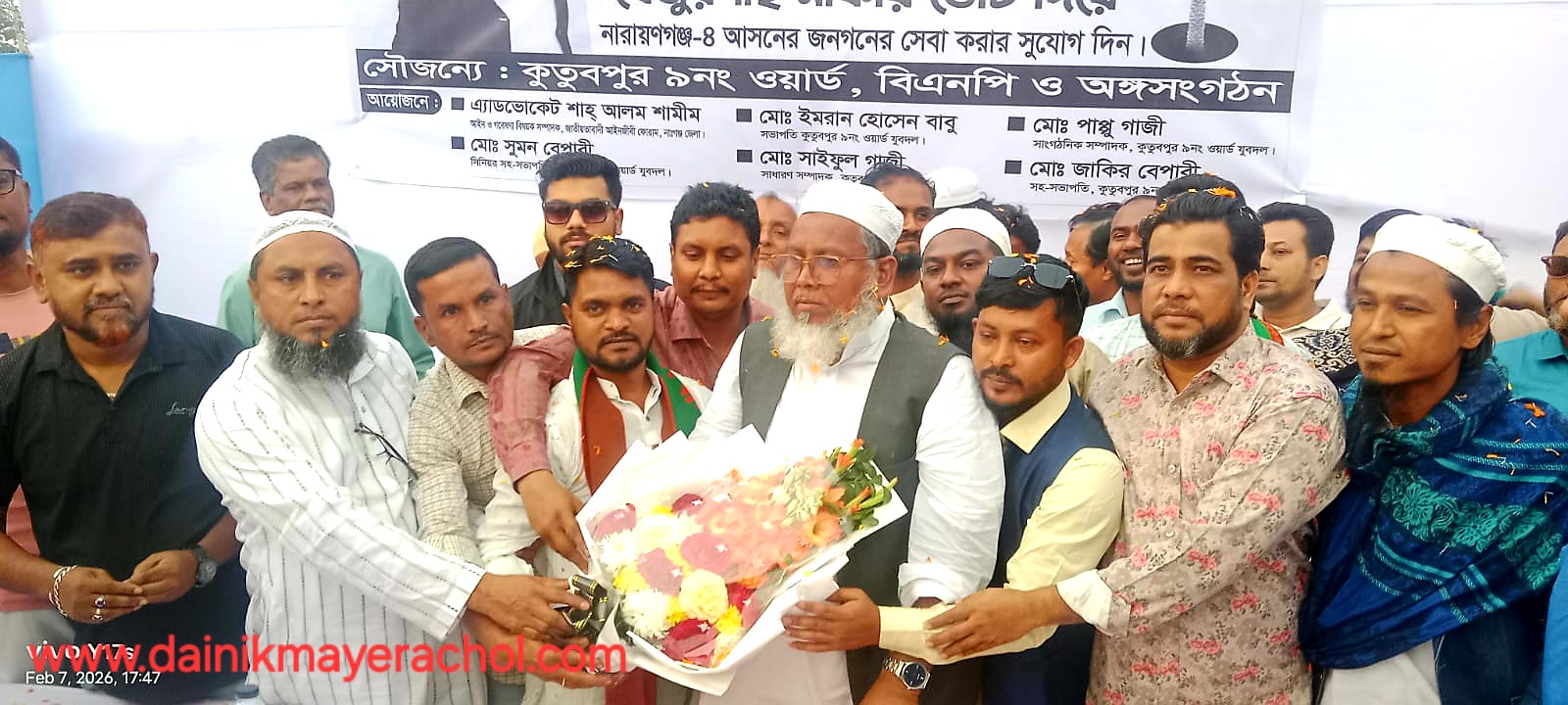 শনিবার ৭ ফেব্রুয়ারী বিকেলে নারায়নগঞ্জ সদর উপজেলার কুতুবপুর ৯নং ওয়ার্ড বিএনপি ও অঙ্গ সংগঠনের আয়োজনে আগামী ৩০ জানুয়ারি শুক্রবার আসন্ন ত্রয়োদশ জাতীয় সংসদ নির্বাচন-২০২৬ নারায়ণগঞ্জ-৪ আসনের বিএনপি- জমিয়ত জোট খেজুর গাছ মার্কায় মনোনীত প্রার্থী মুফতি মনির হোসেন কাসেমী এর উঠান বৈঠক অনুষ্ঠিত হয়েছে।