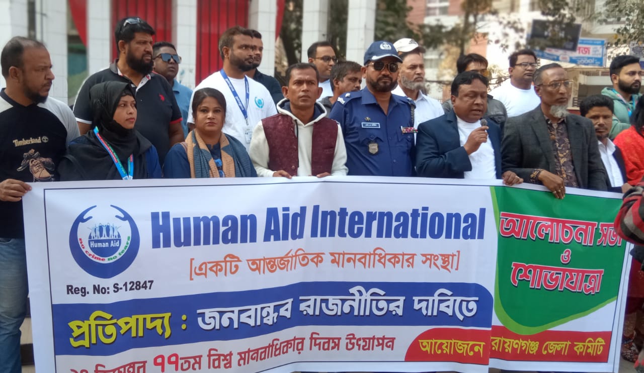 হিউম্যান এইড ইন্টারন্যাশনাল নারায়ণগঞ্জ জেলা শাখার সভাপতি এড.সাহিদুল ইসলাম টিটু'র সভাপতিত্বে ও সংগঠনের সাধারণ সম্পাদক এস,এম,জহিরুল ইসলাম বিদ্যুৎ এর সার্বিক তত্বাবধানে ১০ ডিসেম্বর বুধবার সকাল ৯.৩০ মিনিটে নারায়ণগঞ্জ শহরের চাষাঢ়া জিয়া হল প্রাঙ্গণ থেকে সংগঠনের নেতৃবৃন্দদের উপস্থিতিতে একটি শোভাযাত্রা নিয়ে কেন্দ্রীয় শহিদ মিনারে গিয়ে শেষ হয় এবং শহিদ মিনার প্রাঙ্গণে আলোচনা সভা অনুষ্ঠিত হয়।